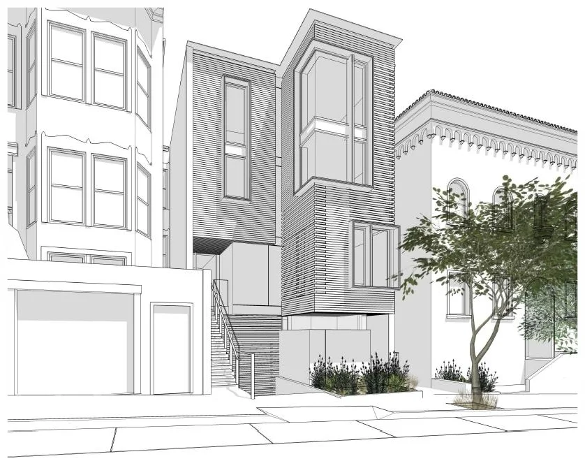 After San Francisco Planning Department’s lukewarm response to a traditional design for 1020 Pine St, Noe Vista reached out to Kennerly Architecture and Planning, a new firm that had recently completed an innovative 3-unit building at 201 Guerrero St. Taking cues from traditional San Francisco pre-war apartment buildings with double-height entries and bay windows, Kennerly creates a dynamic 5-story, 8-unit building which is simultaneously modern, innovative, and classic.
